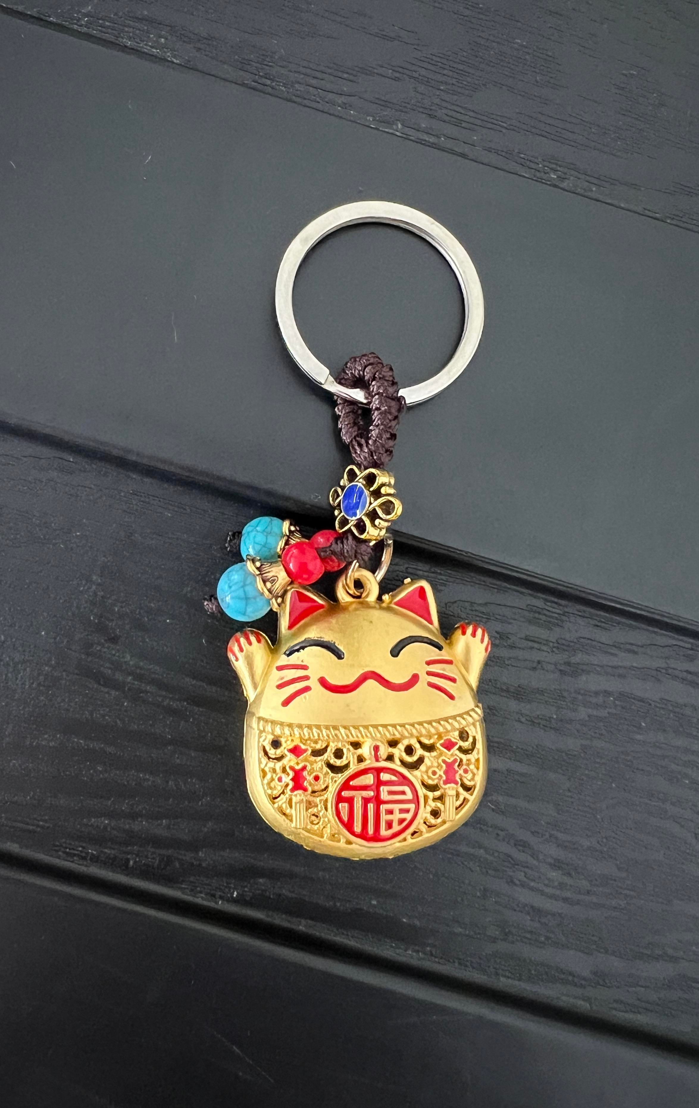Feng Shui Bereket ve Şans Kedisi Anahtarlığı (Maneki Neko Kırmızı Detaylı Gold Anahtarlık) - Miamantra